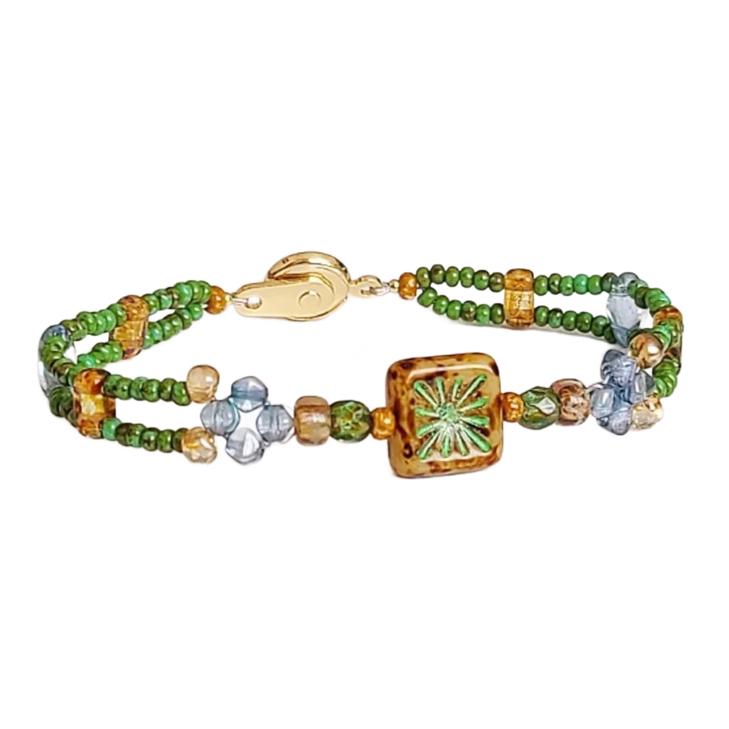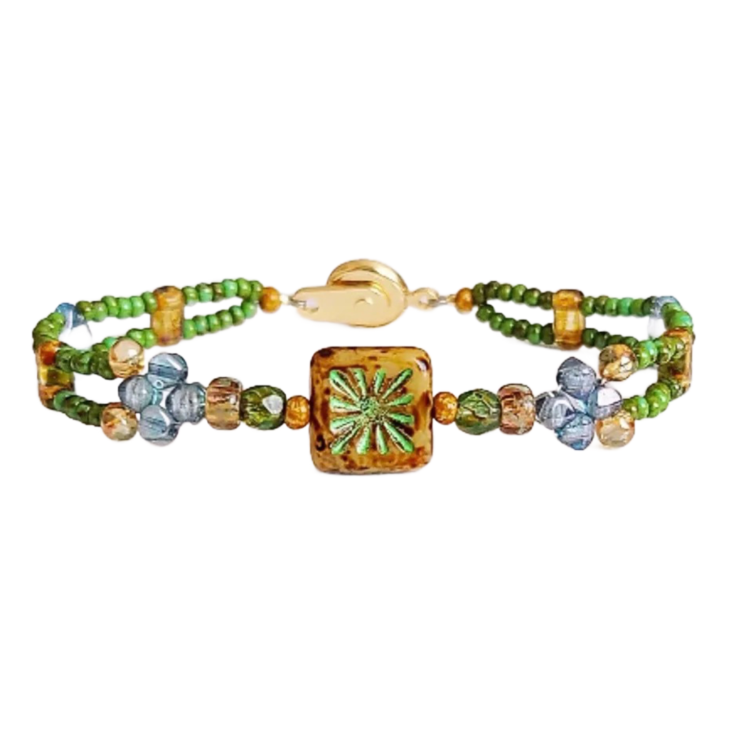 Brighten your style with the Sunlit Meadow bracelet. Handcrafted with authentic Czech beads in fresh greens, soft blues, and golden accents, it brings the warmth of summer sunshine and the calm of open fields to your wrist.
