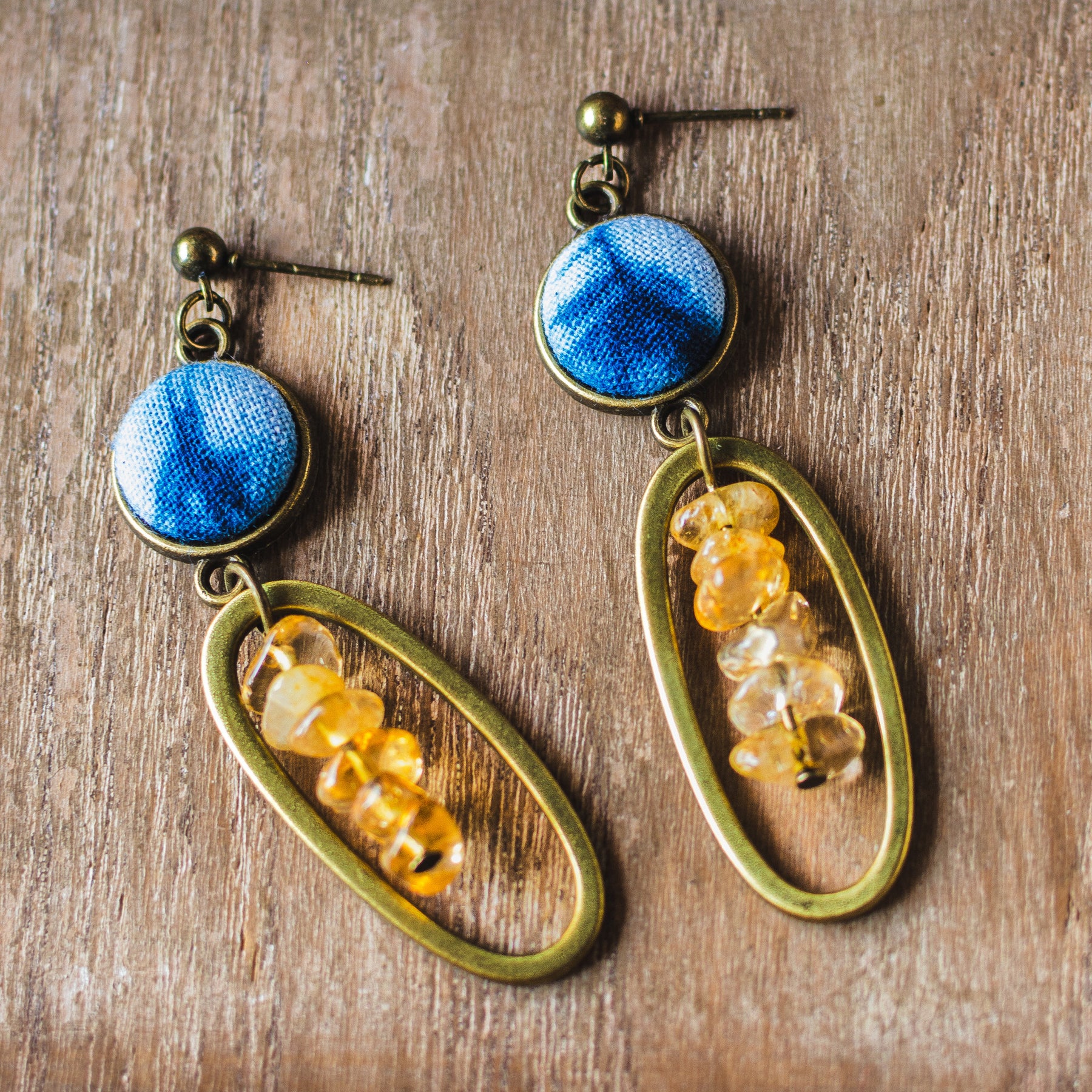 Alloy ear posts (not recommended for sensitive ears), hand-dyed indigo fabric, irregular natural citrine stones, and antique-finish alloy components.